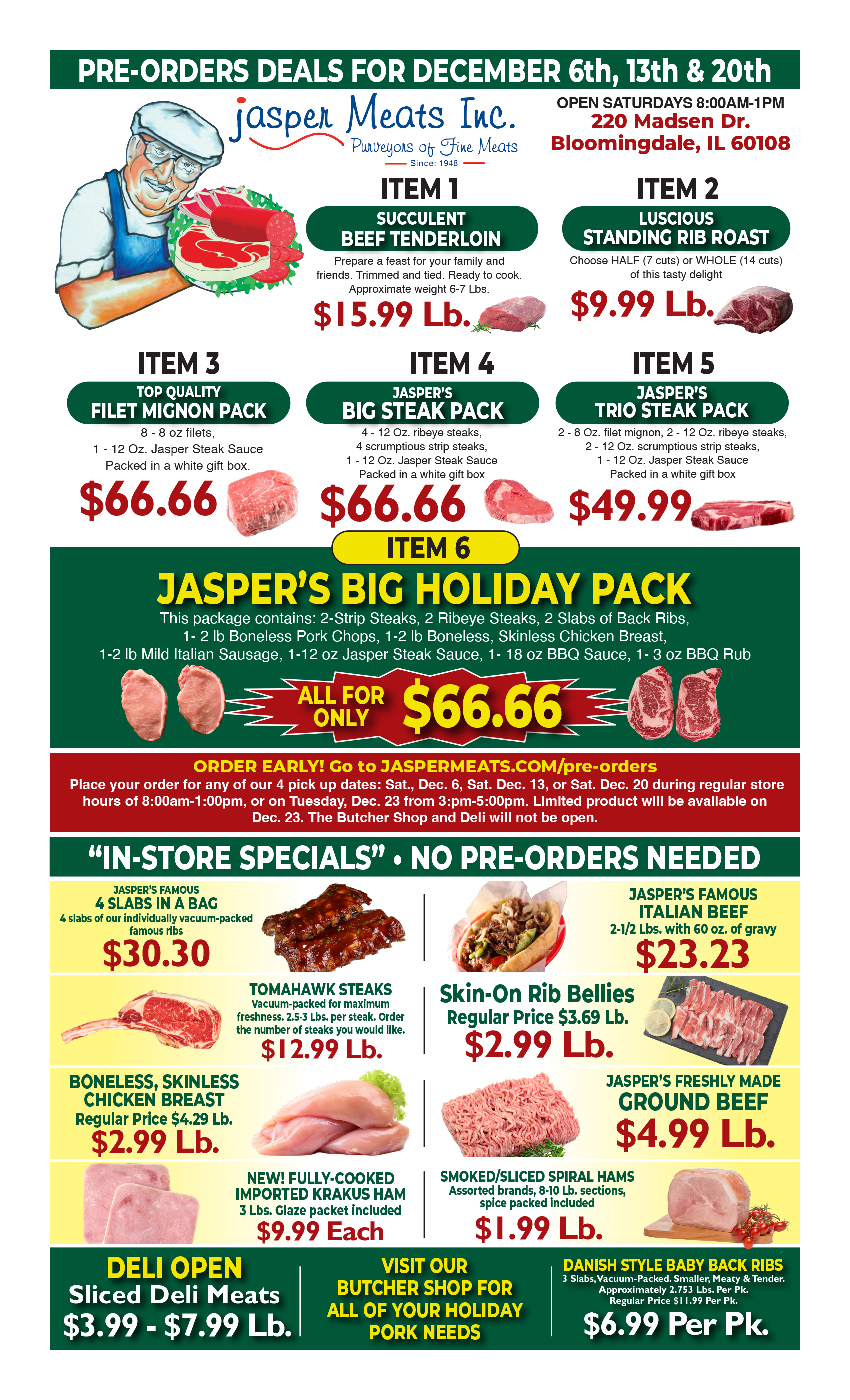 Holiday Pre-orders! Order now to secure one of these 6 juicy and delicious items; Beef Tenderloin, Standing Rib Roast, Beef Tenderloin Pack, Filet Mignon Pack, Big Steak Pack, Big Trio Pack, and our Jasper’s Big Holiday Pack!