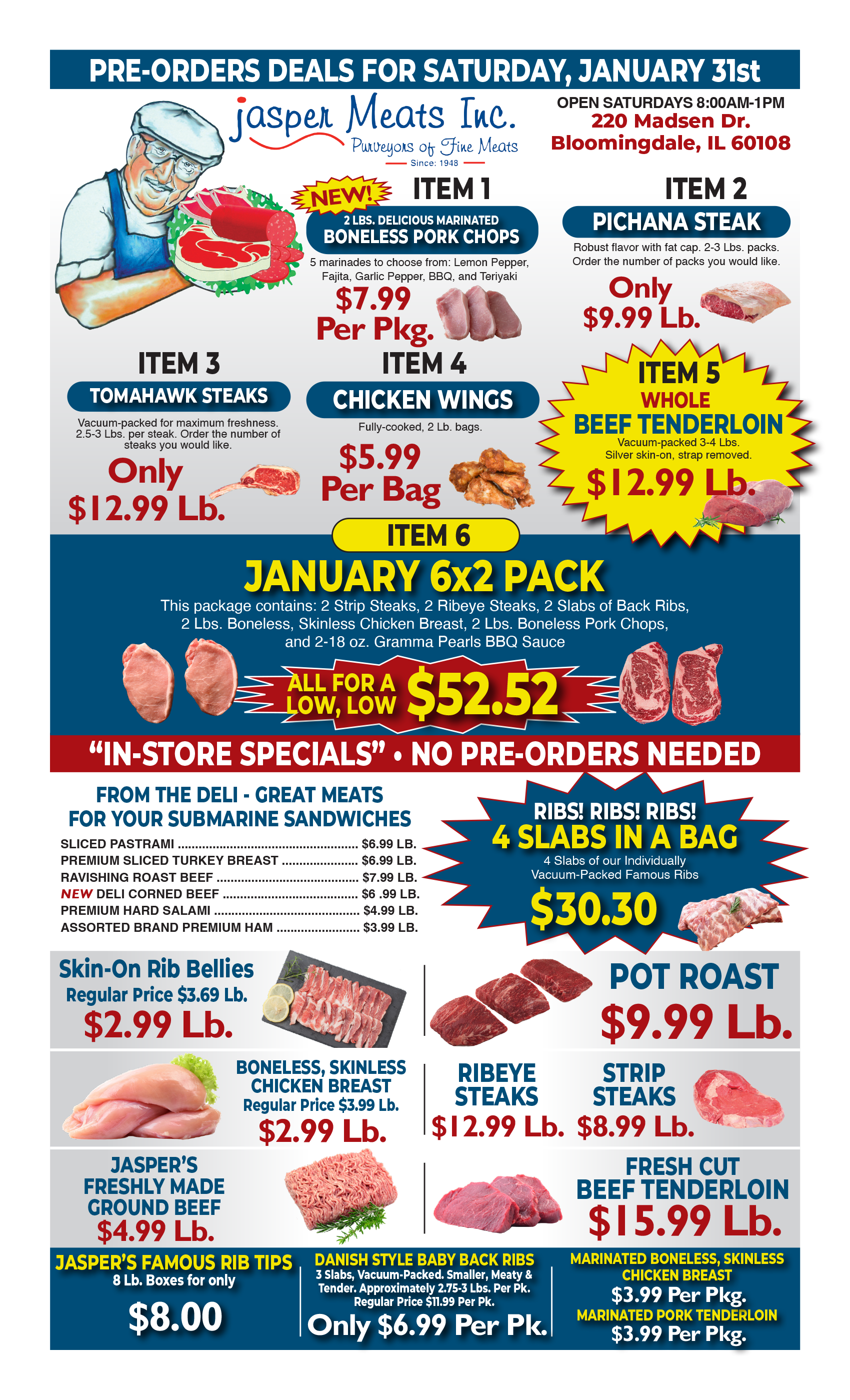 Order now to secure one of these 6 juicy and delicious items; Marinated Pork Chops, Pichana Steak, Tomahawk Steaks, Chicken Wings, Whole Beef Tenderloin, and our January 6×2 Pack!