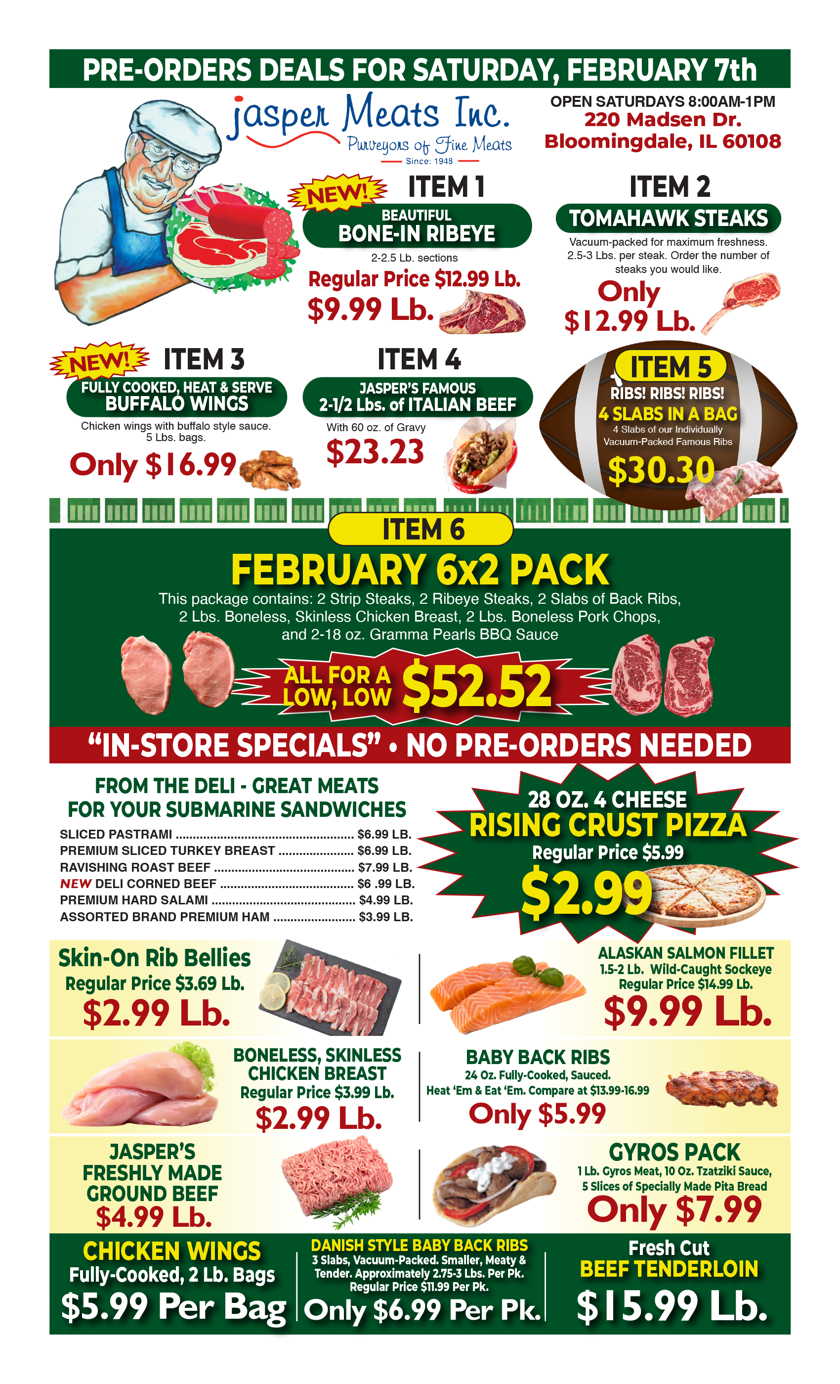 Order now to secure one of these 6 juicy and delicious items; Bone-In Ribeye Steaks, Tomahawk Steaks, Buffalo Wings, Italian Beef, Our Famous 4 Slabs of Ribs, and our February 6×2 Pack!