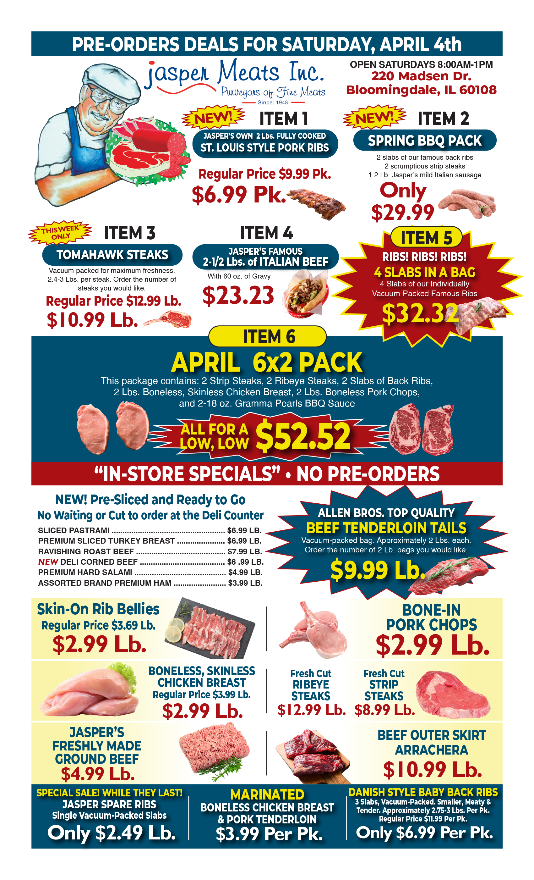 Though we are a wholesale meat market for businesses and restaurants, we are open to the general public 5 hours every Saturday from 8am – 1pm, a small window of opportunity to save more. Put this on your reminder or memo list. When you start out shopping, come here first. You will have plenty of time to visit the other stores. So make a point not to miss out on the savings. This could be the best 5 hours you will spend. Hope to see you all here at Jasper Meats!