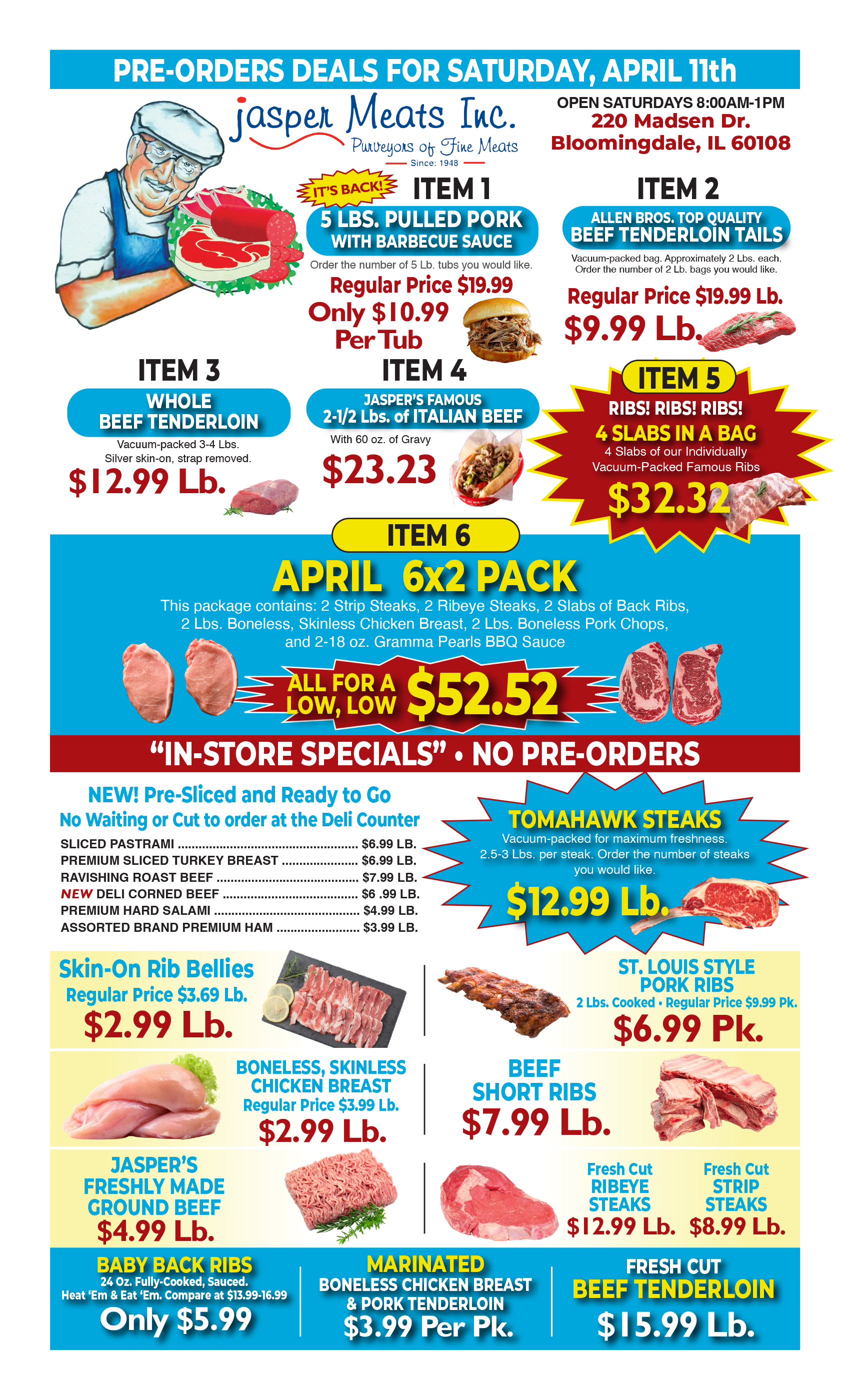 Order now to secure one of these 6 juicy and delicious items; Pulled Pork, Beef Tenderloin Tails, Whole Beef Tenderloin, Italian Beef, Our Famous 4 Slabs of Ribs, and our April 6×2 Pack!